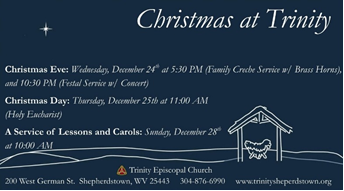 +Christmas Poinsettias: If you would like to make a dedication for this year’s Christmas Poinsettias, there is a sign-up sheet below the bulletin board in the Fellowship Hall or email the office. Please provide your name and the dedication you wish to have listed in the Christmas bulletins. For anyone desiring to make a donation to help off-set these floral costs, you can do so by cash or check made payable to Trinity Episcopal Church with ‘Christmas Poinsettias’ in the memo line. If paying in cash, please also designate that this is for poinsettias. Payments can be placed in the weekly offering plate or turned in to the office. The deadline for dedications is Sunday, December 21st.